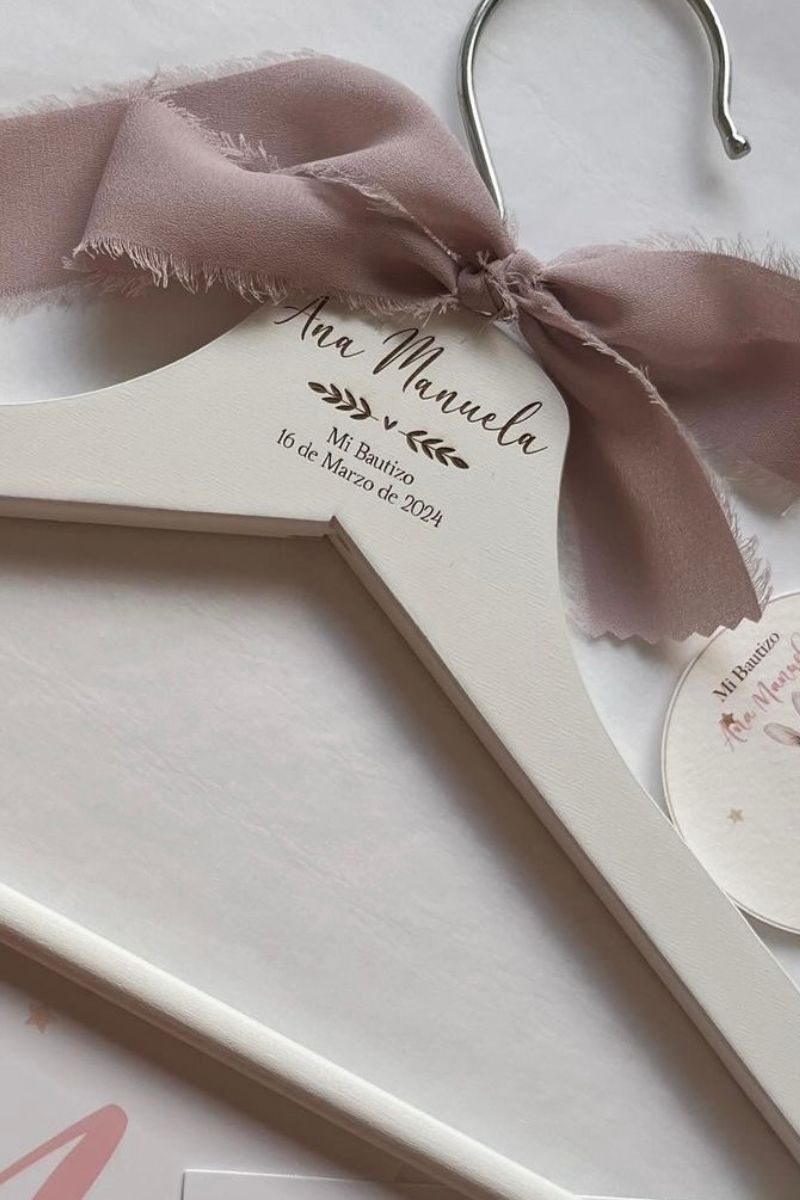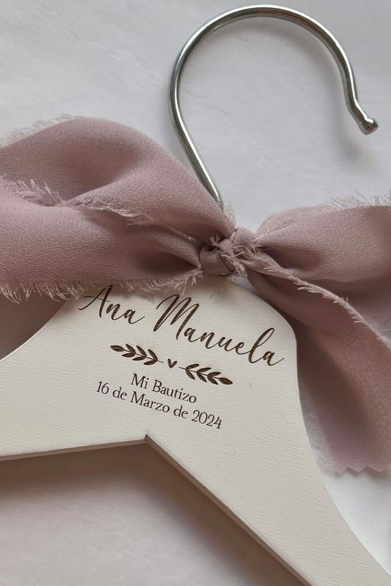 Haz que el día del bautismo de tu peque sea aún más especial con nuestra percha personalizada. Diseñada para colgar su vestido, esta percha se convierte en un detalle único y significativo que guardará para siempre.